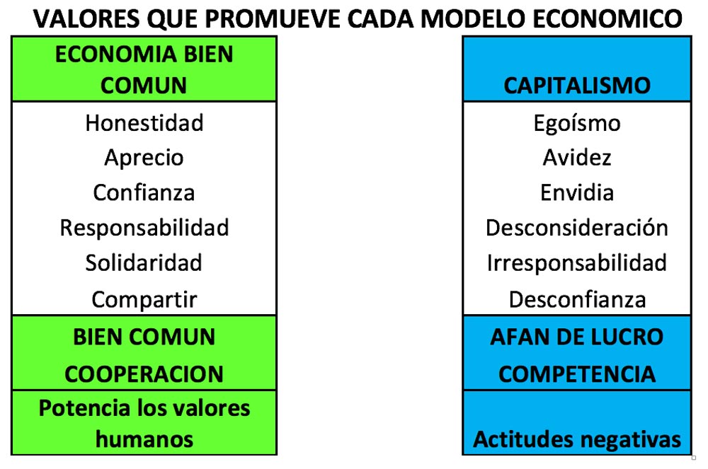 EBC (Economía del Bien Común, Felber 2010): “Respuesta sensata alejada de transformaciones radicales. En un contexto de competencia libre pero leal, para alcanzar un desarrollo humano y económico sostenible, una prosperidad compartida. Completando el capitalismo con una “economía cooperativa de mercado”. “Es un sistema económico con rostro humano”.