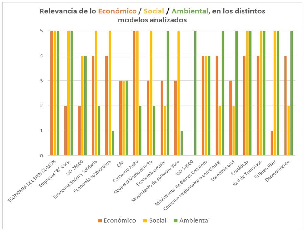 En este esquema se comparan los diferentes modelos económicos a partir de la importancia que le otorgan a los ámbitos económico, social y medioambiental:
